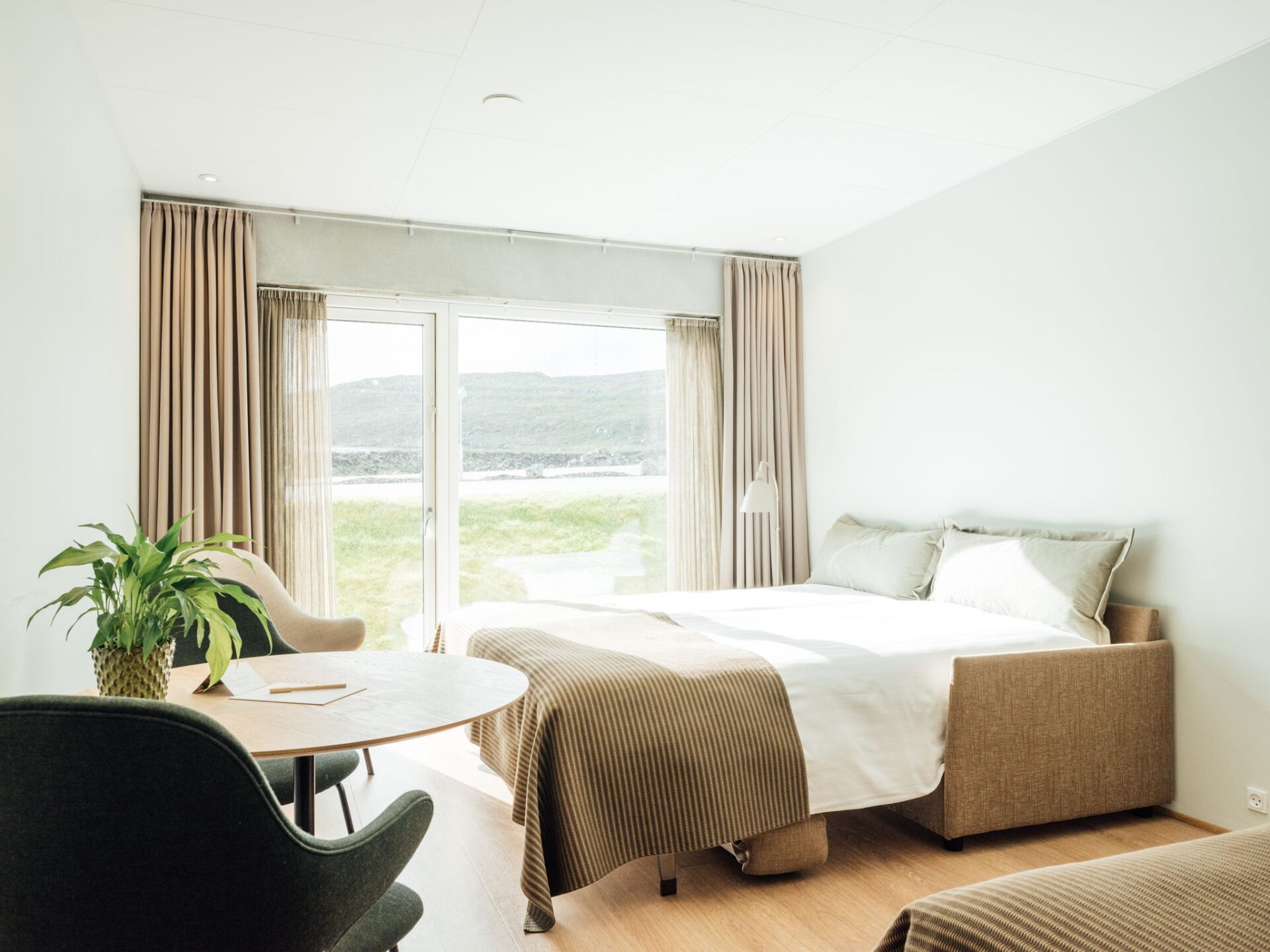 The hotel is the largest hotel in the Faroe Islands, beautifully situated on the hillside above Tórshavn. From here, you can enjoy stunning views over the capital, the island of Nólsoy, and the mighty North Atlantic Ocean. The hotel is renowned for its peaceful atmosphere, modern comfort, and unique location close to both nature and city life.